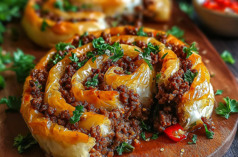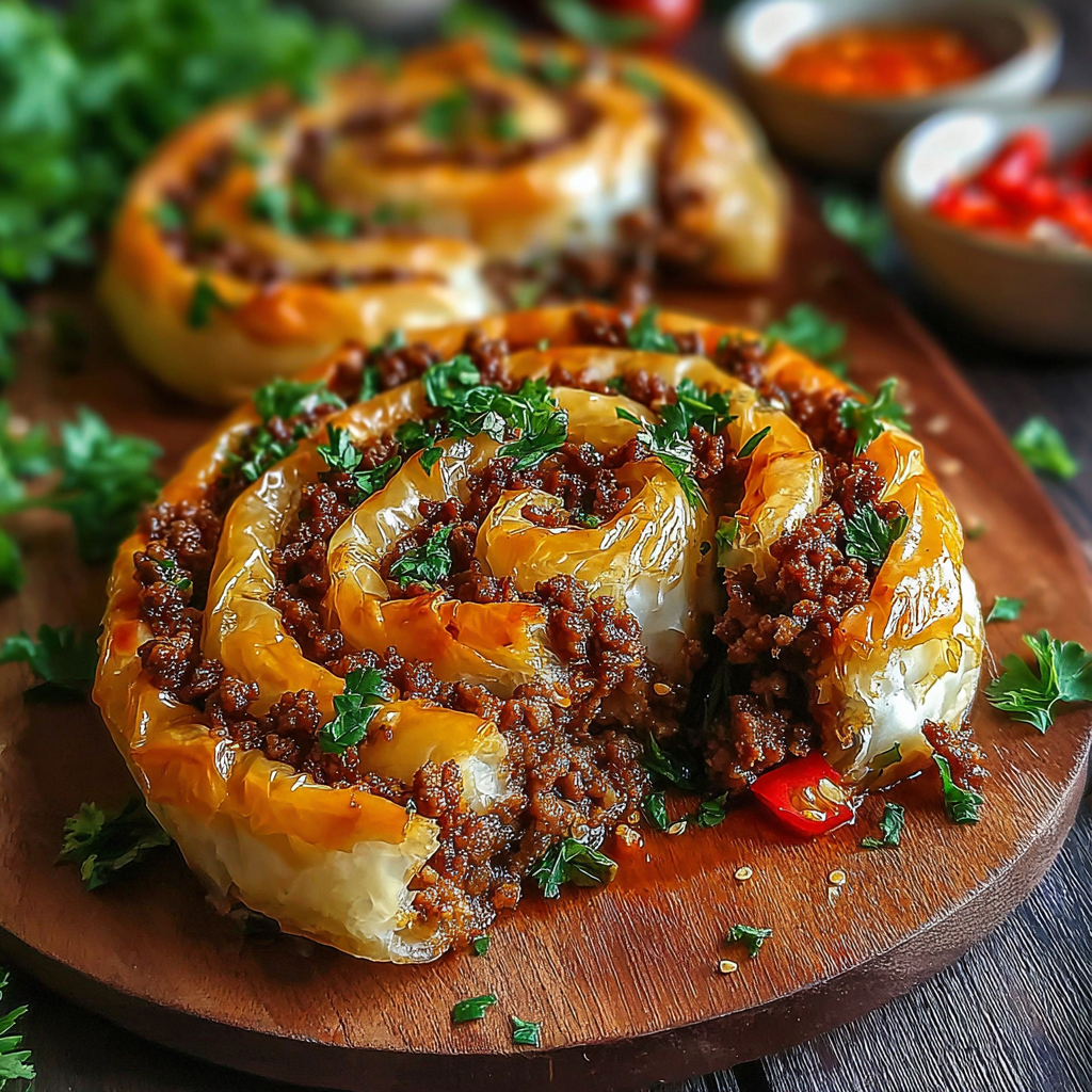 Türkische Spiral-Börek mit gewürztem Rinderhackfleisch sind eine wahre Freude für den Gaumen. Sie kombinieren knusprigen Teig mit einer herzhaften Füllung und sind ideal für jede Gelegenheit.